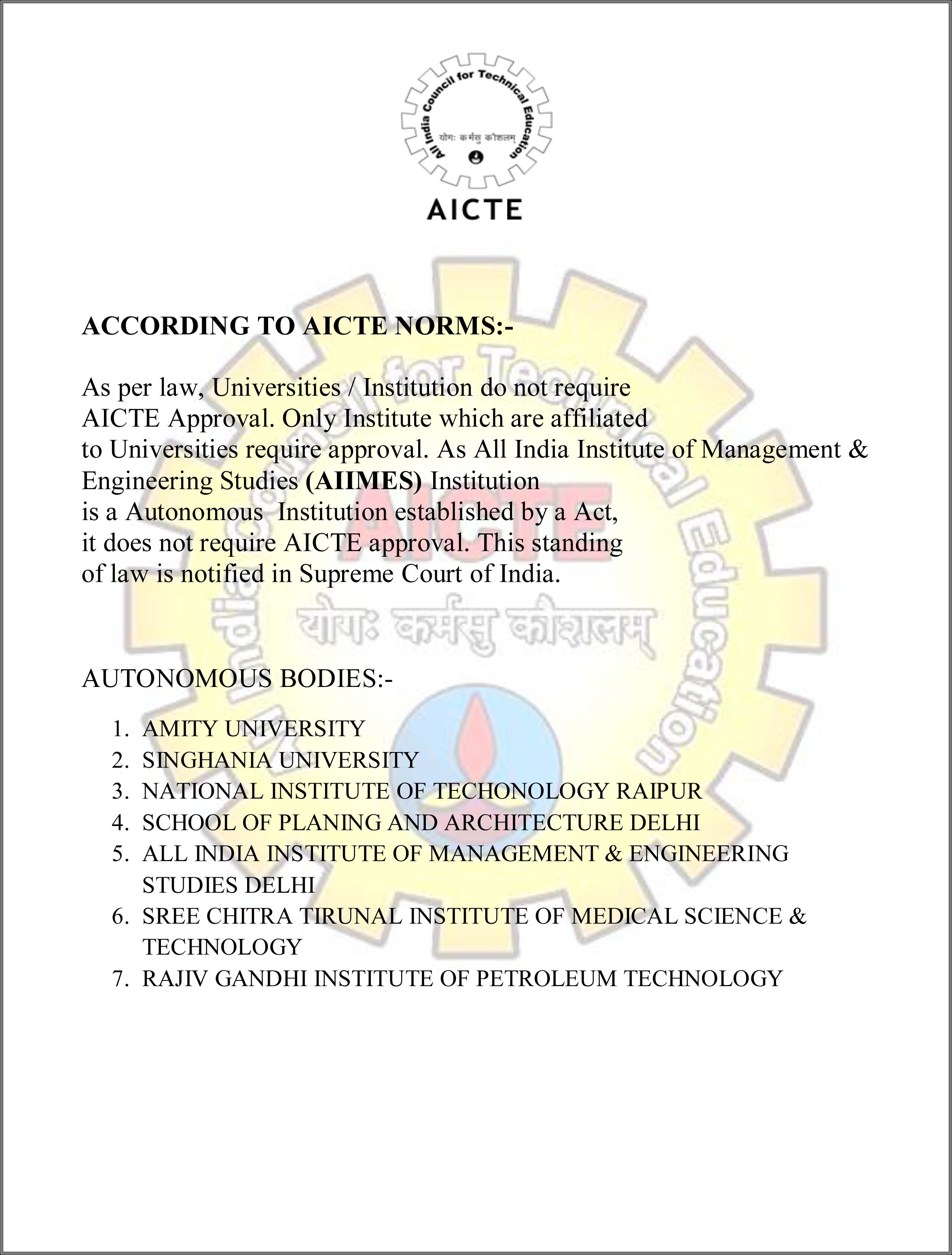 Delhi was inspired by the Government of India’s Human Resource Development minister Mr. Matheo Rao Scindhia who has introduced Private Universities Bill for the first time in the parliament and since then the Society has marched ahead covering a long distance till what it is today on its own footing and established an institute named ALL INDIA INSTITUTE OF MANAGEMENT & ENGINEERING STUDIES in 2014 to provide distance education in Computer, Management , Architecture, ITI, Polytechnic and Engineering field.