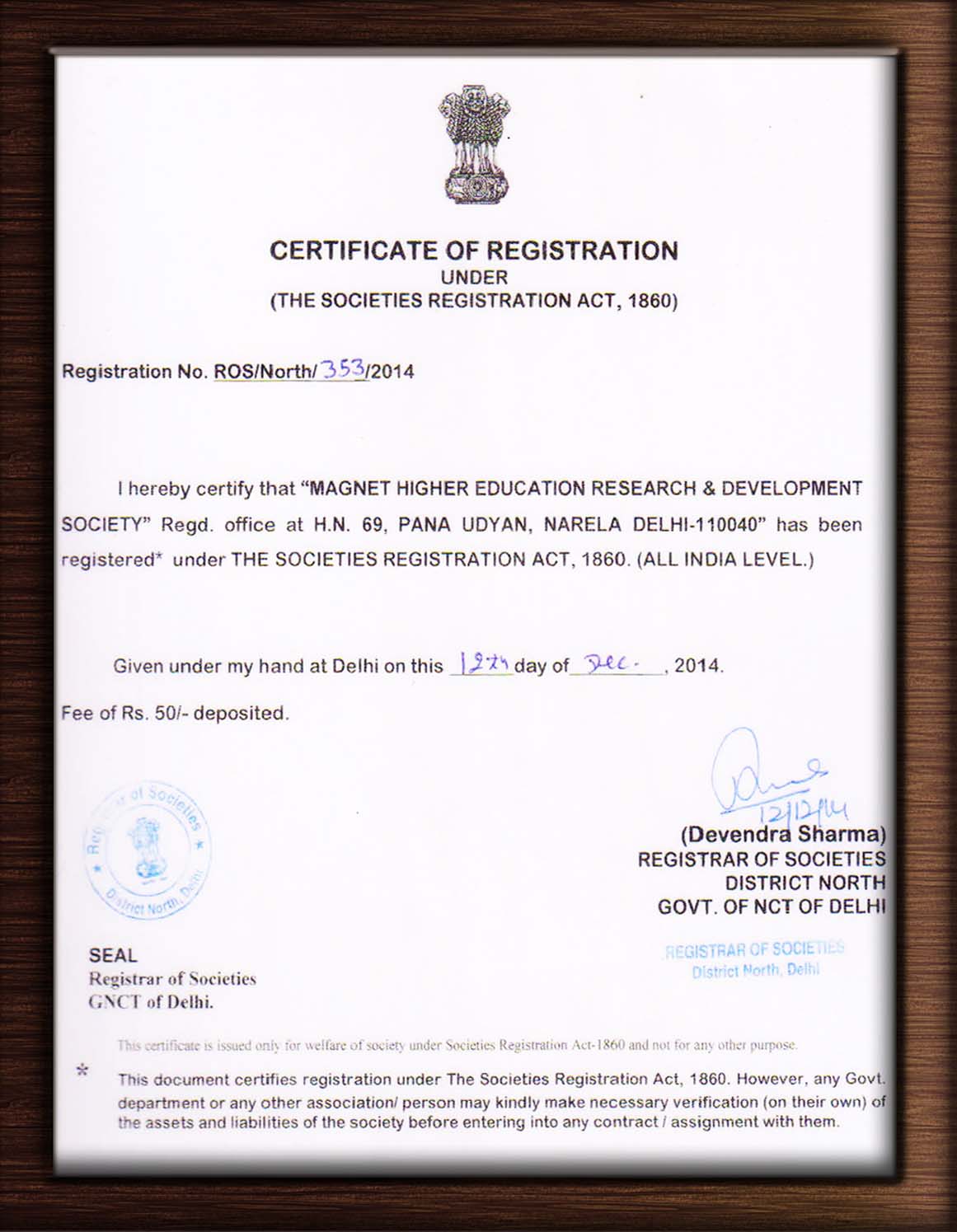 REGISTRATION : The society’s registration ACT 1860 MHERD Registration no./NORTH/353/2014